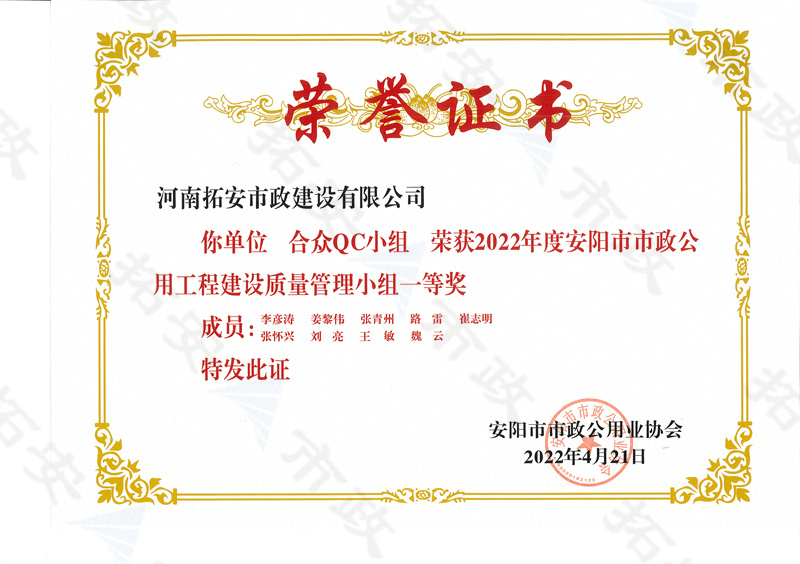 (市級)合眾QC小組榮獲安陽市市政公用工程建設質量管理小組一等獎