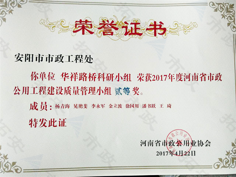 (省級)華祥路橋科研小組榮獲河南省市政公用工程建設質量管理小組二等獎