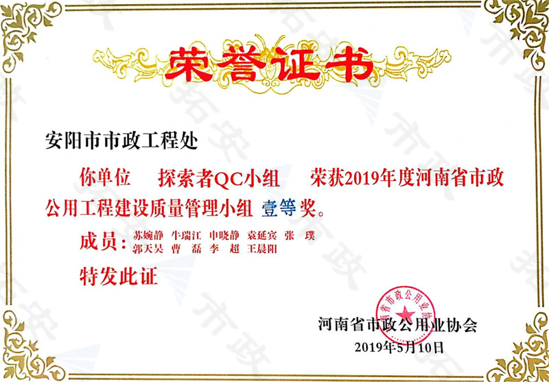 (省級(jí))探索者QC小組榮獲河南省市政公用工程建設(shè)質(zhì)量管理小組一等獎(jiǎng)