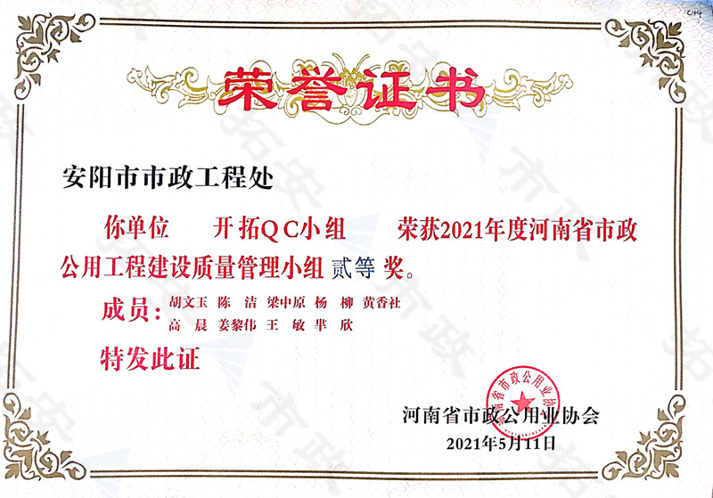 (省級)開拓QC小組榮獲河南省市政公用工程建設(shè)質(zhì)量管理小組二等獎