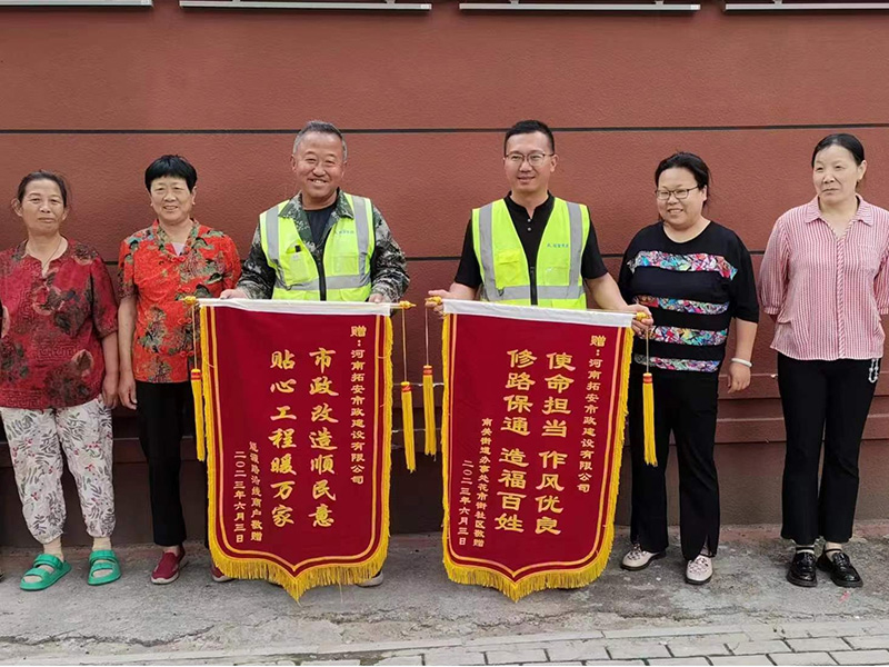 6月4日,南關街道辦事處花市街社區和能源路沿線商戶代表將兩面分別寫有“使命擔當 作風優良 修路保通 造福百姓”和“市政改造順民 意 貼心工程暖萬家”的錦旗贈予我公司,對我公司“為民修路辦實事,解決群眾出行難題”的使命擔當表示衷心地感謝。